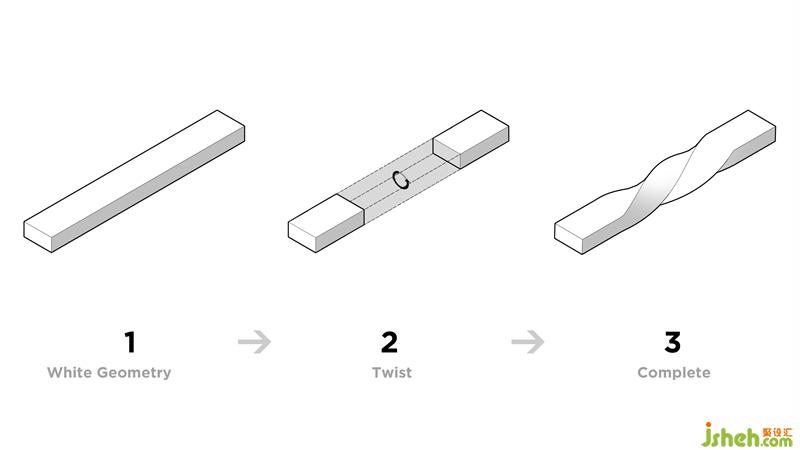 The geometric elements of the lobby evolve in relation to the spatial scale of the hallway.