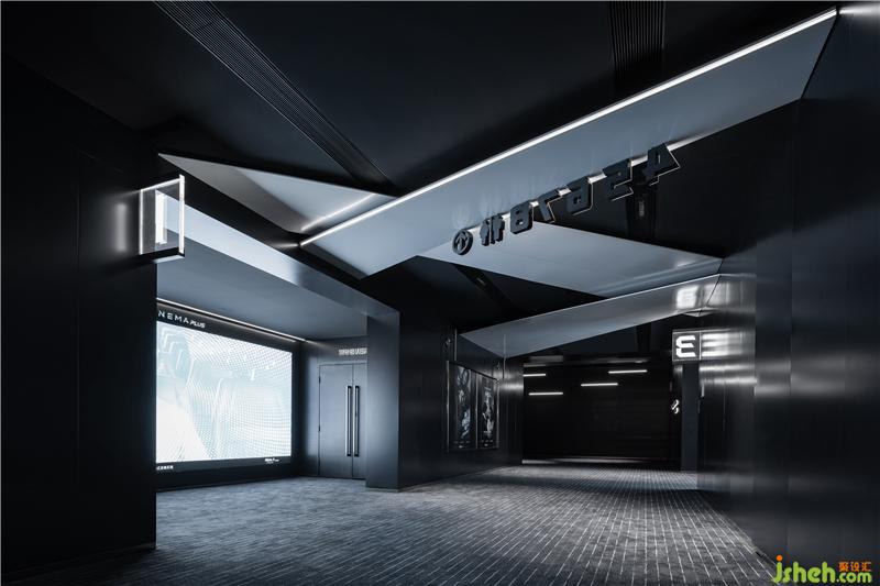 走進(jìn)觀影主通道,好似流星般的光線安放在兩側(cè)墻壁,天花的黑色鏡面反射拓展了空間,在暗色的映襯下仿佛充盈未來(lái)感的時(shí)光隧道。地面上強(qiáng)烈的方向性紋理延伸至盡頭,為觀影者帶來(lái)視覺(jué)上的動(dòng)態(tài)體驗(yàn),同時(shí)引導(dǎo)觀影者不斷前行。