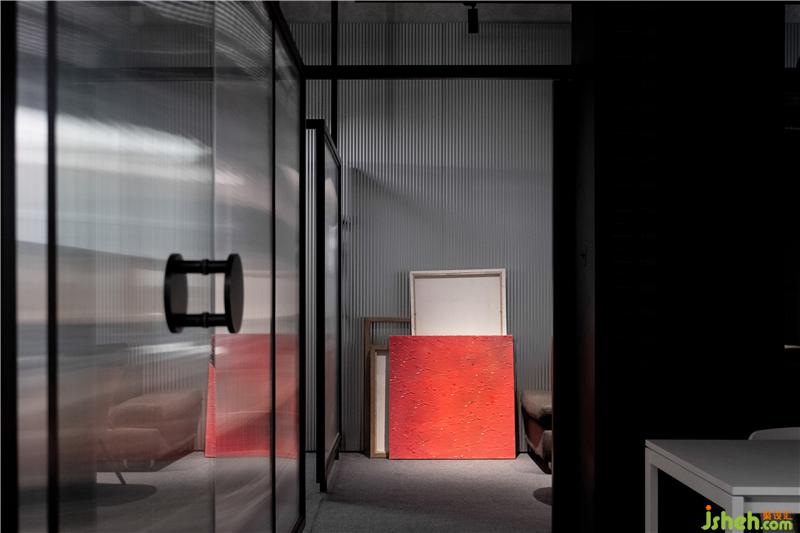 通過(guò)前廳進(jìn)入室內(nèi)辦公區(qū),空間的基調(diào)由亮轉(zhuǎn)暗,自然的完成了空間氛圍與情緒的轉(zhuǎn)換。