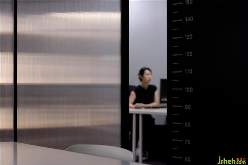 考慮工作性質(zhì)帶來(lái)的人群聚散,置于空間中的盒子區(qū)規(guī)劃為會(huì)議室和總監(jiān)辦公室,盒子的兩側(cè)的公共辦公區(qū)則分布了設(shè)計(jì)辦公區(qū)和其他輔助部門(mén)辦公區(qū),動(dòng)線圍繞兩個(gè)盒子展開(kāi)。會(huì)議室以通透的玻璃隔斷圍合,而辦公室盒子則以雙層陽(yáng)光板及玻璃圍合,滿足辦公室一定程度的私密需求。