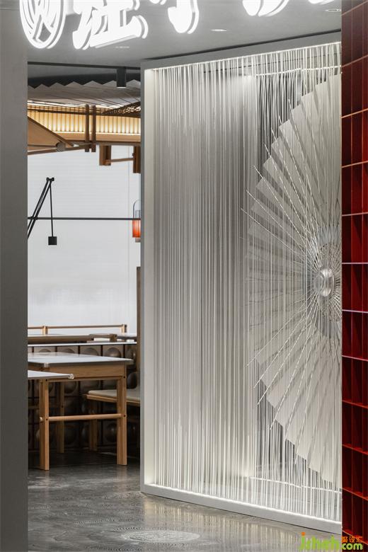 在入口處設(shè)置的動態(tài)雨傘裝置,通過傘面裝置和傘架裝置雙層反向旋轉(zhuǎn)的形式,南寧餐廳設(shè)計形成空間的視覺焦點(diǎn),同時在入口處也隱約可見該裝置,給人以探究的欲望。