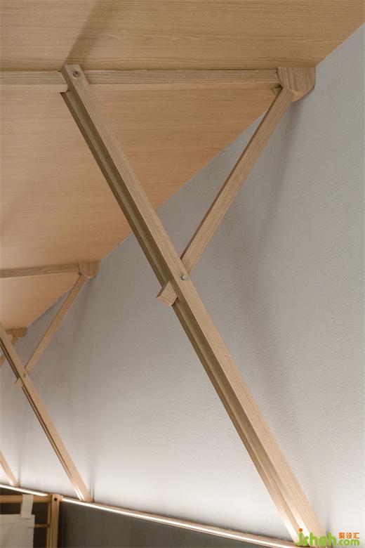 The umbrella frame made of wood constructs the form and structure of the eaves, which creates a unique outdoor experience in the interior. The lantern-shaped ceiling lamp under the eaves further emphasizes the feeling of sheltering from the rain.