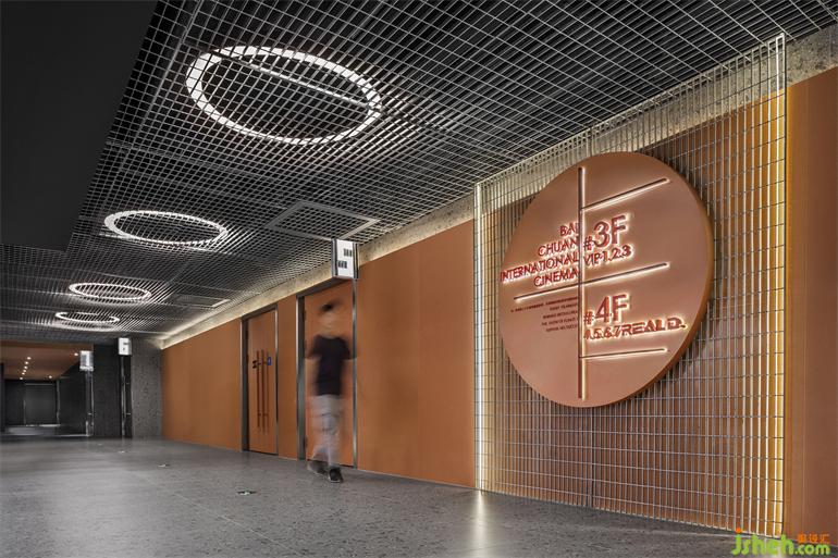 影院跨越兩層,上方一層不設(shè)大堂,MOC沿用了設(shè)計元素,影城設(shè)計將亮橙色運(yùn)用于立面,天花則保留了一層大廳的環(huán)形燈與隔柵的做法,使整個空間在統(tǒng)一的調(diào)性中又富有變化。