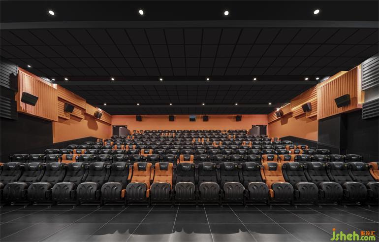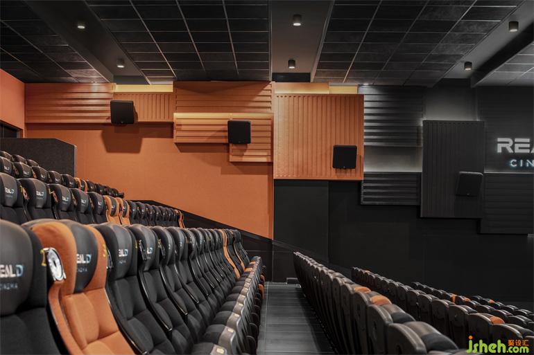 影廳設計結合結構體塊與色彩進行設計,影城設計在滿足影音效果需求的基礎上,在暗色調之上疊加少量亮橙色與結構,讓影廳更具動感與沉浸感。