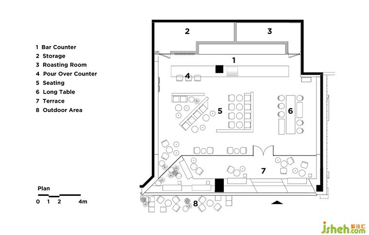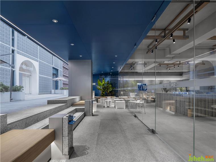 咖啡廳設(shè)計(jì)透明玻璃模糊了邊界,室內(nèi)以矮墻圍合出不同的座位區(qū)