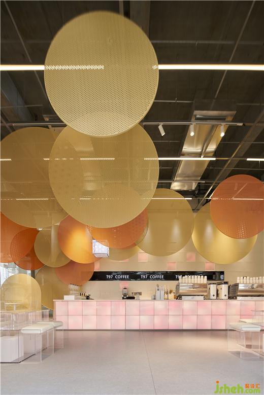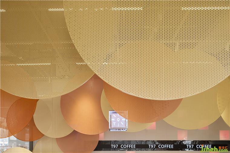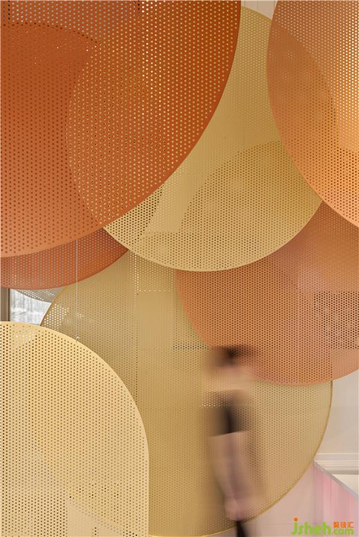 咖啡店設(shè)計空間內(nèi)部保留了裸露的混凝土天花,在其中搭建框架,框架上方用懸掛固定不同大小的定制沖孔板,不同大小的橙色系沖孔板構(gòu)筑出的色彩層次,抽象化的回應(yīng)秋日印象,與戶外的逐步變黃的綠植景觀互相呼應(yīng)。