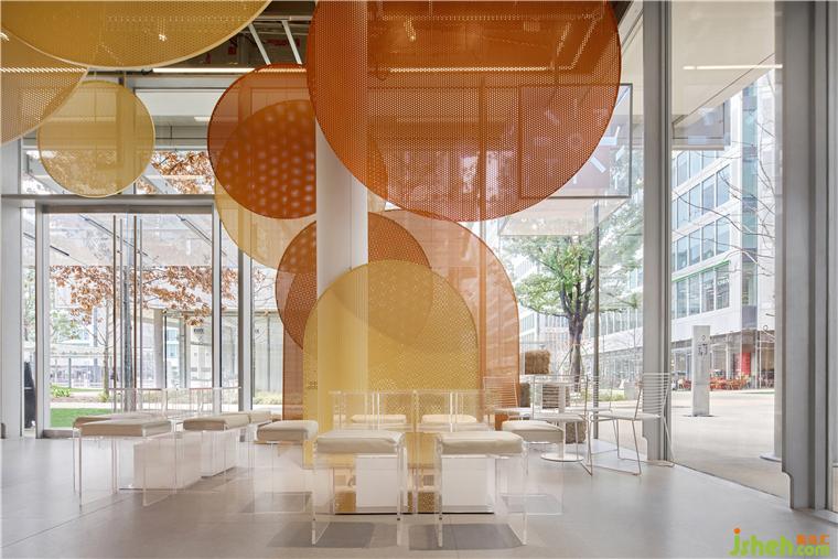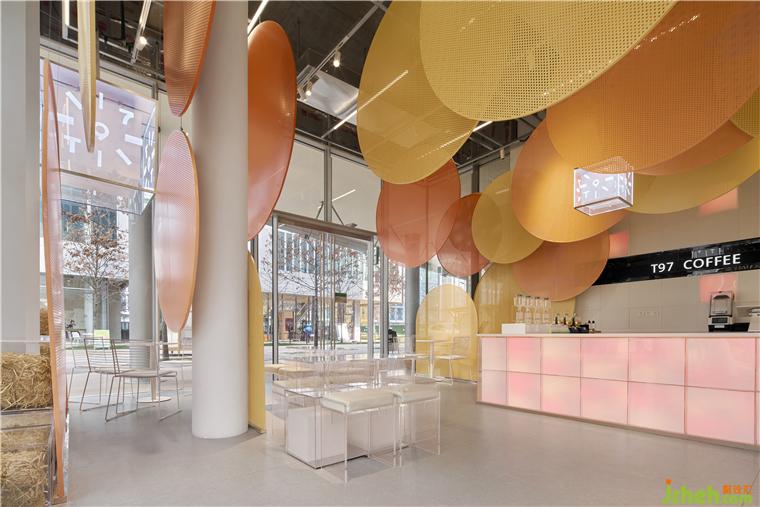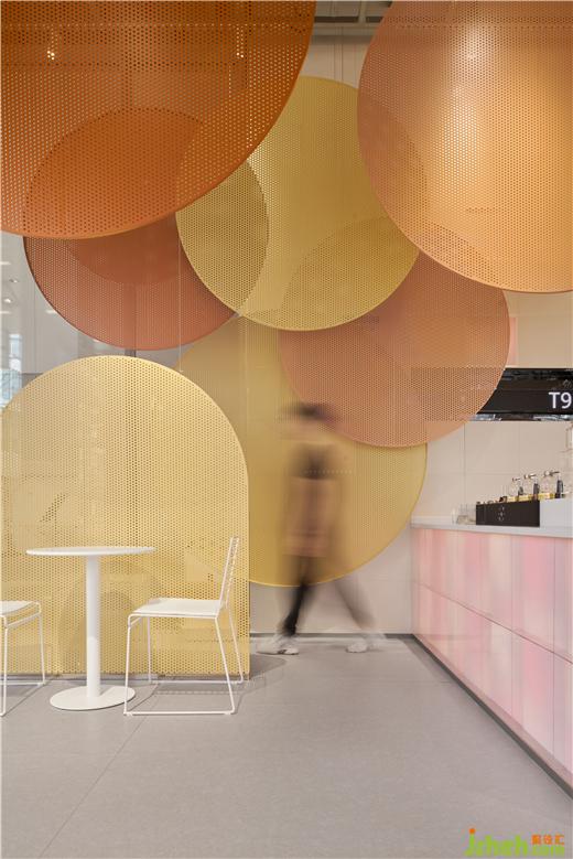 吧臺內(nèi)置可變色燈板,咖啡店設(shè)計除了匹配秋季色彩主題,更考慮后續(xù)可根據(jù)不同季節(jié)場景調(diào)整匹配的顏色。