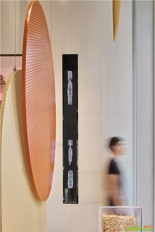 咖啡店設(shè)計以空間懸掛的裝置作為場景視覺焦點,我們?nèi)趸思揖叩拇嬖诟?,為該項目定制了透明亞克力的茶幾和展臺,透明亞克力內(nèi)部可填充對應(yīng)季節(jié)的內(nèi)容物。在本場秋季主題中填充草垛回應(yīng)季節(jié)特點。
