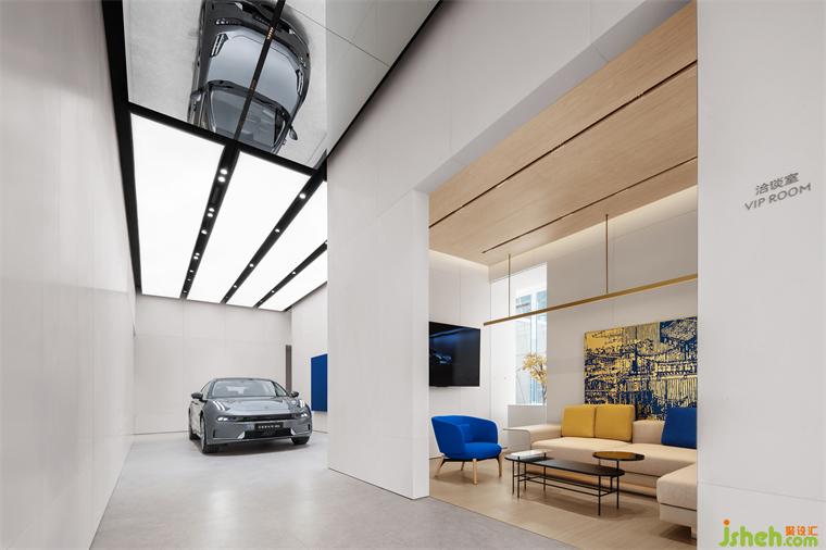 極氪中心西安南湖金座展廳設(shè)計從展車區(qū)也可以看到空間中部的展車。在兩個展車區(qū)域之間,我們依承重墻規(guī)劃了VIP洽談室,承重墻的外側(cè)一圈則形成了開放式的洽談區(qū)域。