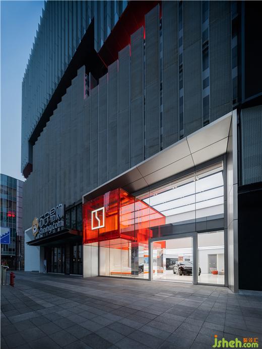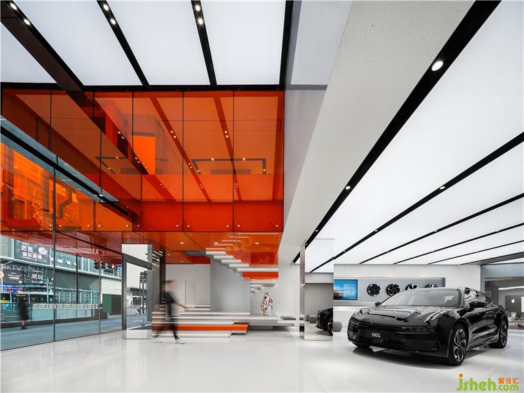 極氪中心展廳設(shè)計(jì)建筑立面的框架與結(jié)構(gòu)被極大的簡化,材料語言的統(tǒng)一性加強(qiáng)了色彩的張力對比,大廳前部的挑空處理,讓懸挑的橙色玻璃盒子體塊得以貫穿進(jìn)室內(nèi),構(gòu)成了豐富的空間層次,也為空間注入了品牌精神力與趣味性。