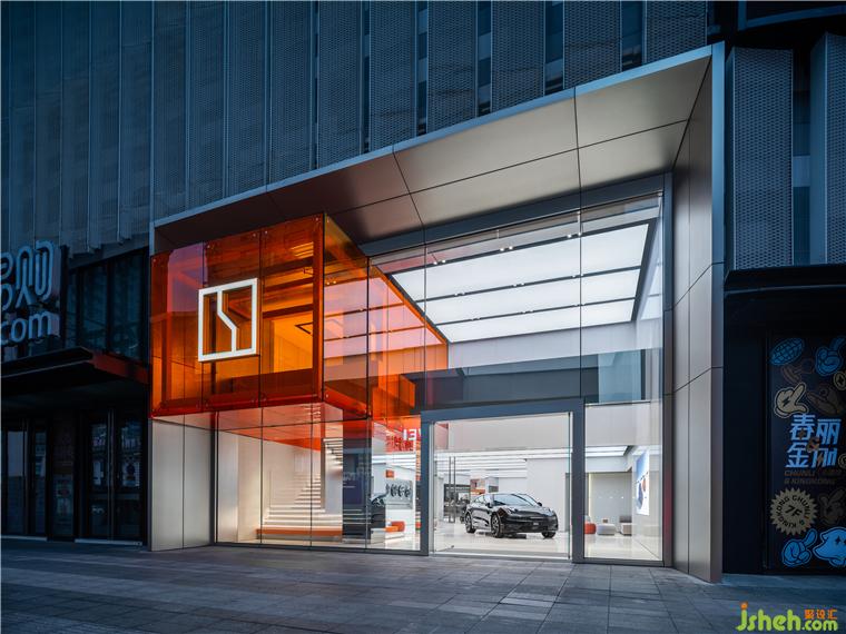 不同于常規(guī)商業(yè)邏輯一望而透的處理方式,設(shè)計(jì)師選擇跳出窠臼,從新的角度重新詮釋事物,極氪中心展廳設(shè)計(jì)以一個“懸浮的”橙色透明盒體從室外貫通進(jìn)室內(nèi),通過極具張力的色彩和結(jié)構(gòu),豐富了城市界面并開啟與街區(qū)的對話。