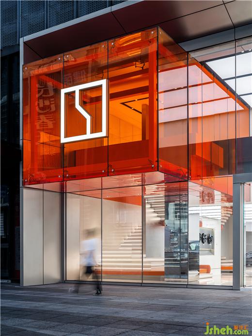 The building’s facade boasts a simplified yet striking frame and structure. The use of consistent materials enhances the dramatic color contrast, while the hollow structure of the lobby creates a pathway for the suspending orange glass box to penetrate into the interior. It adds depth and complexity to the space and effectively injects the brand’s spirit and playfulness.