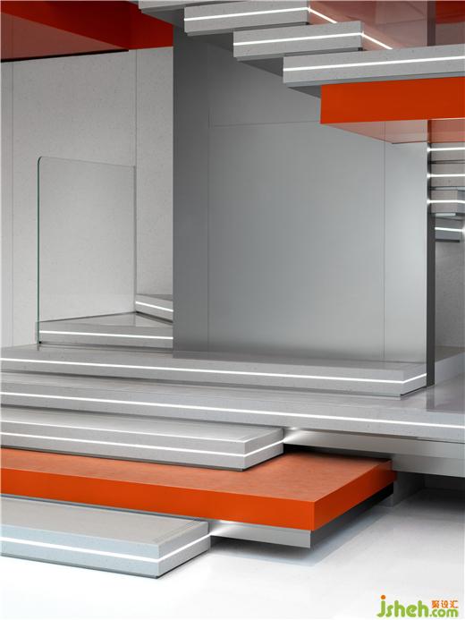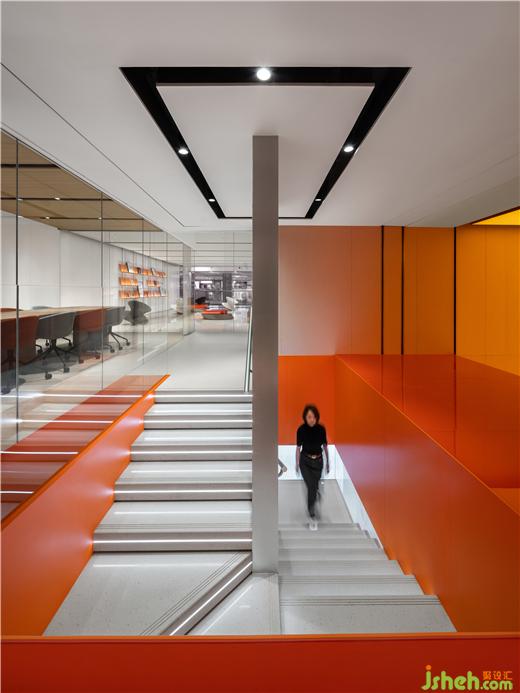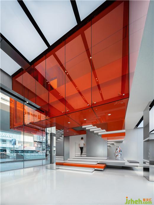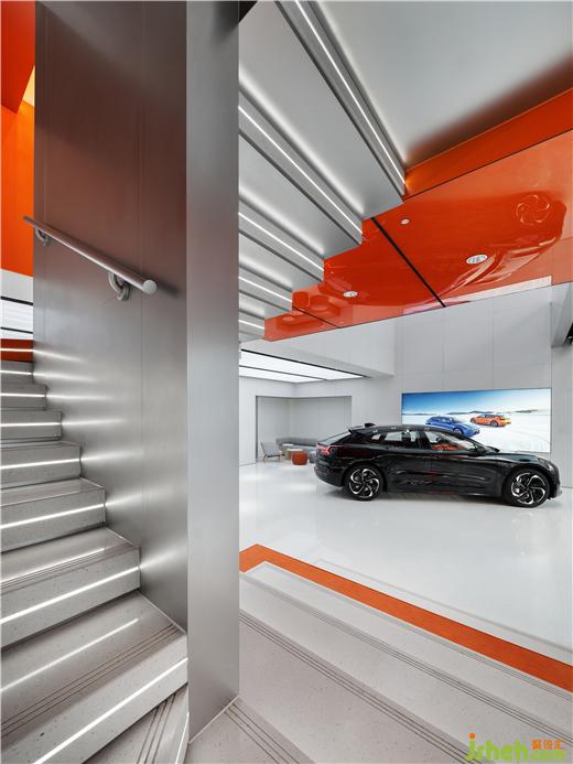 極氪中心展廳設(shè)計(jì)師通過內(nèi)退的大廳立面和“懸浮”的橙色玻璃盒子,隔開了川流不息的街道與室內(nèi)的聯(lián)系,同時(shí)也在展車區(qū)與用戶區(qū)之間置入了一個(gè)橙色的過渡空間,實(shí)現(xiàn)喧囂與沉靜之間的平衡與銜接,為用戶創(chuàng)造了一個(gè)沉浸感的場(chǎng)域環(huán)境。