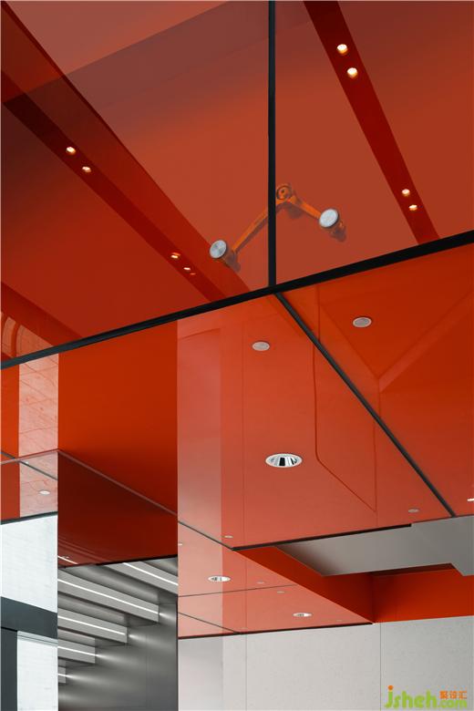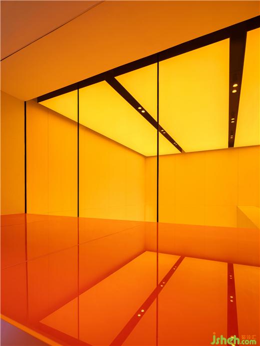 The designers effectively separated the interior space from the busy street through the use of a receding lobby facade and the orange glass box. This approach achieves a delicate balance and precise articulation between the bustling energy of the street and the peaceful silence within, creating a fully immersive environment for users to enjoy.