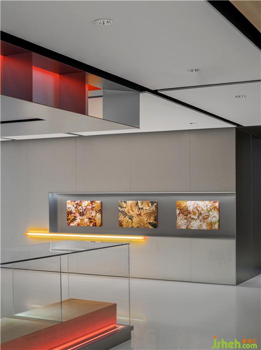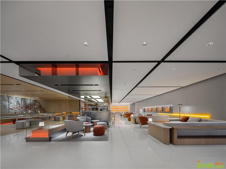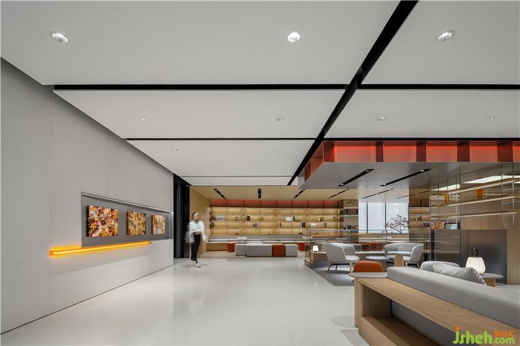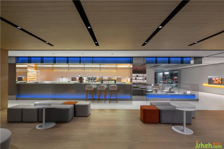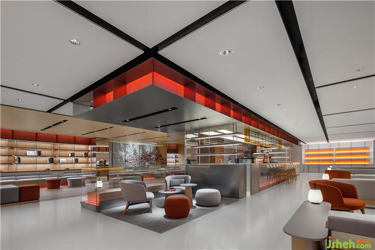 極氪中心展廳設(shè)計(jì)師通過(guò)燈光色彩和明暗調(diào)節(jié)設(shè)置回應(yīng)不同時(shí)段的城市煙火——白天是工作休閑的咖啡時(shí)光,夜晚則是氛圍感十足的微醺時(shí)間。