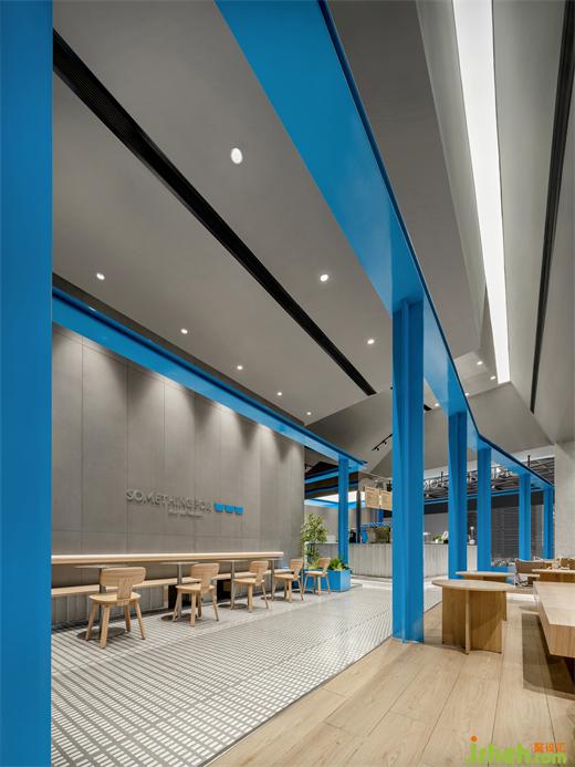 咖啡廳設計師利用空間的縱向尺度,通過跌級高差形成采光天井,內(nèi)置的燈膜灑下的均勻光線渲染了空間的自然氛圍。