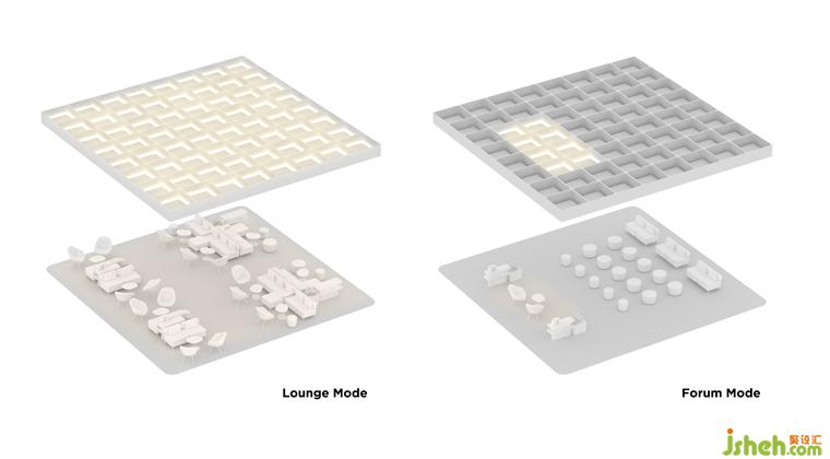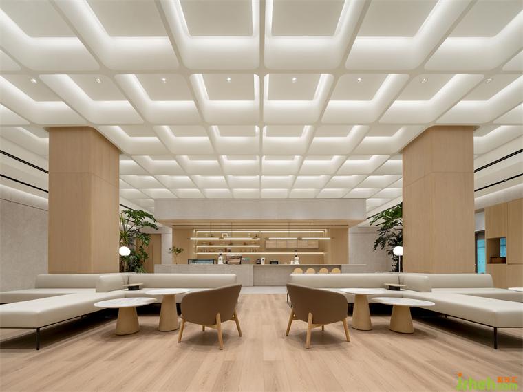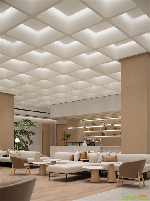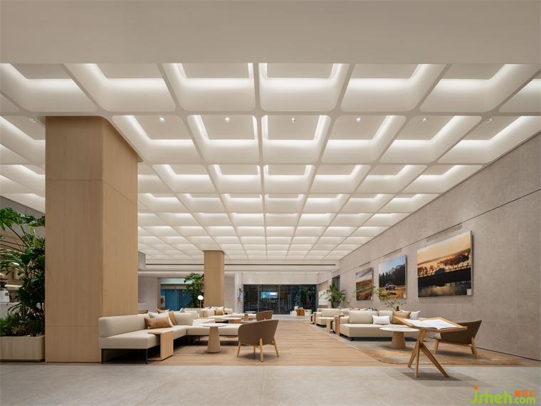 方格天花下方是一個(gè)更加靈活、開放、可變的社交空間,深圳展廳設(shè)計(jì)師通過活動家具的調(diào)整來滿足多樣化的使用場景,并結(jié)合不同的場景需求,設(shè)置了多種燈光模式進(jìn)行匹配。