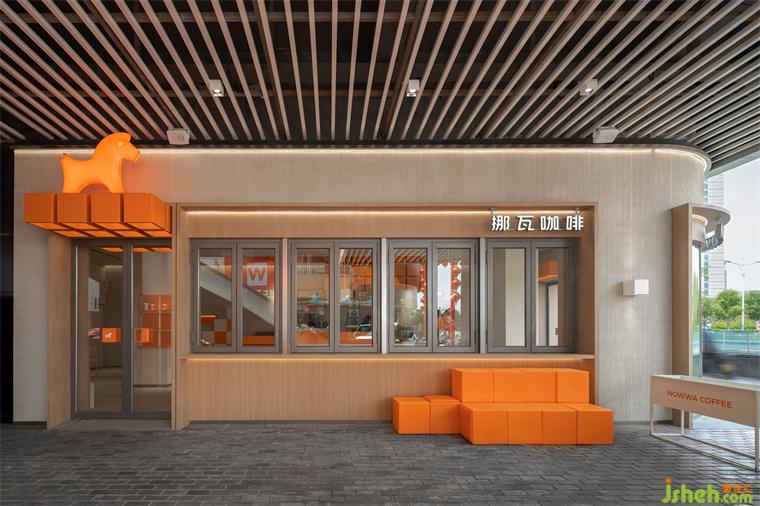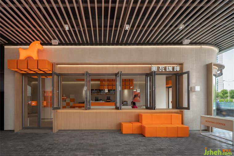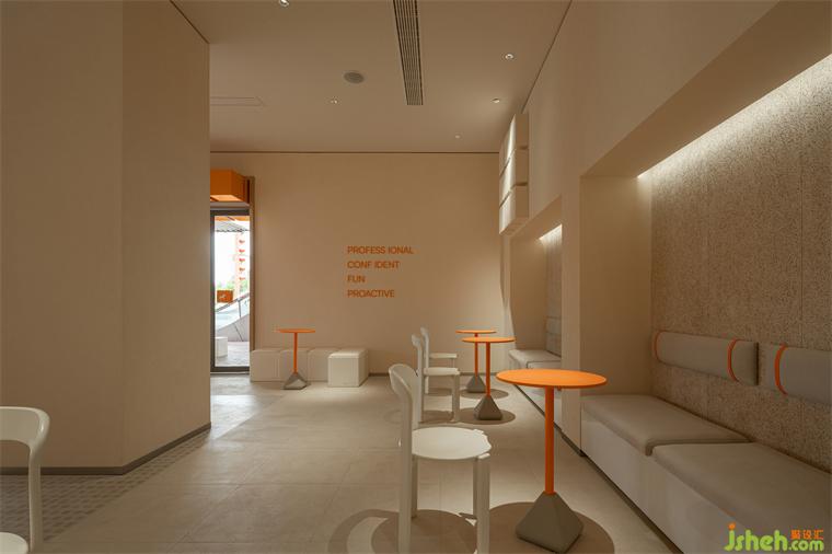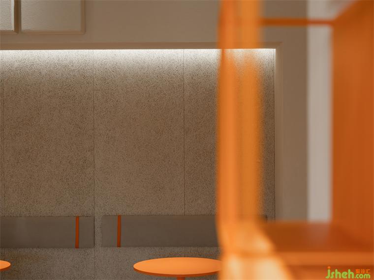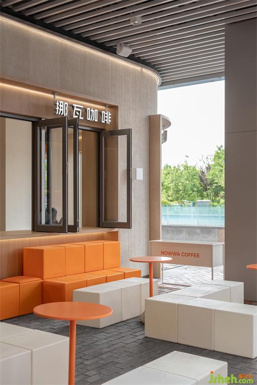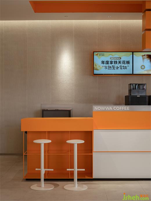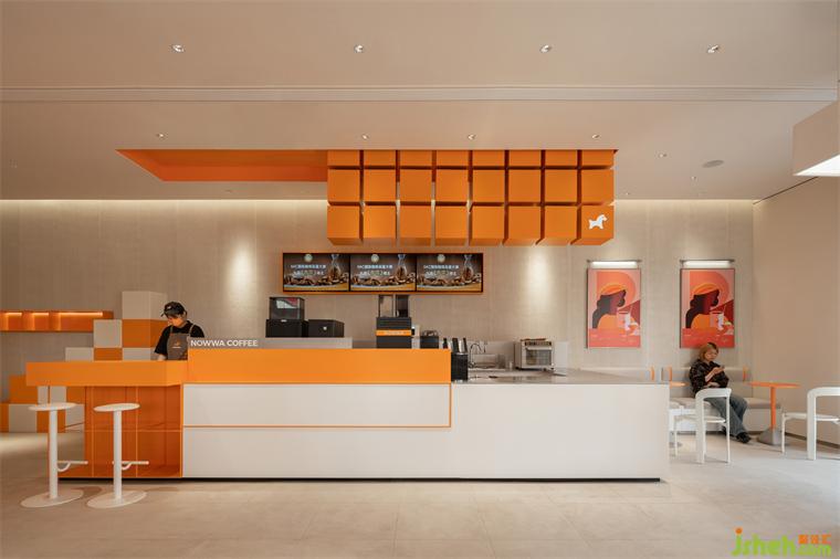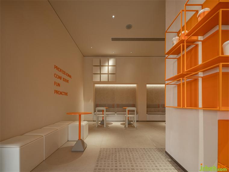 橙色的cube縱向疊起,成為吧臺(tái)區(qū)域重要的識(shí)別元素??臻g系統(tǒng)設(shè)計(jì)延長的吧臺(tái)高凳區(qū),則以cube框架的形式與吊楣的體塊形成呼應(yīng)。橙色和白色的組合明亮活潑,簡約的線條不失嚴(yán)謹(jǐn),這一組合后續(xù)將作為辦公大堂店的模板使用。
