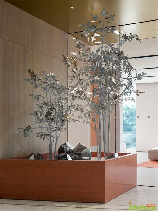南天竺的形態(tài)被藝術性地呈現(xiàn)在空間中,設計師運用銀色和金屬以及米灰色的皮革,以人造的質(zhì)感模擬植物的葉片。藝術裝置點綴著金色金屬制成的果實,將綠植轉(zhuǎn)化為引人注目的藝術品。