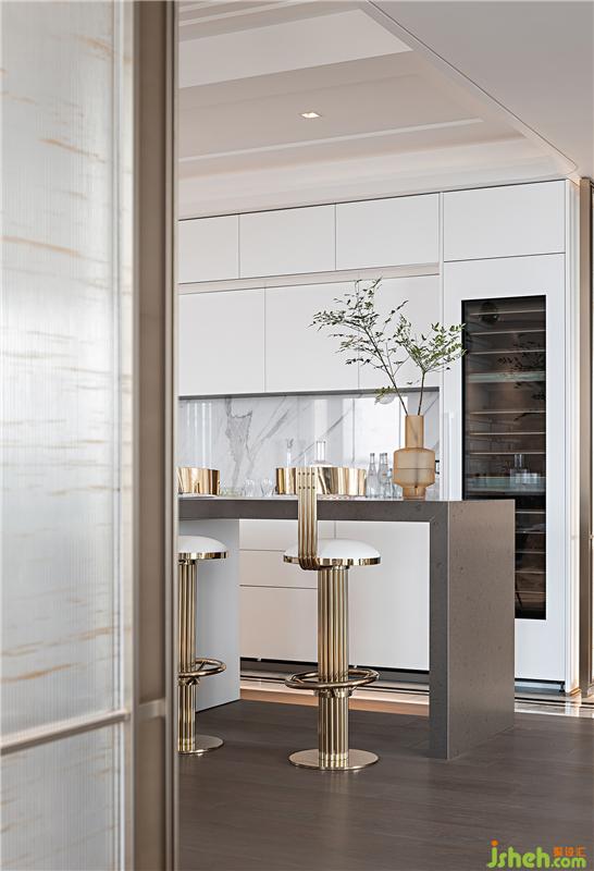 餐廳背景的阿瑪尼墻布是設計靈感最初的空間映界,也是自然元素與品質生活的對話,我們用它解讀業(yè)主的生活格調,也印證自然元素的時尚質感。 裝修設計
