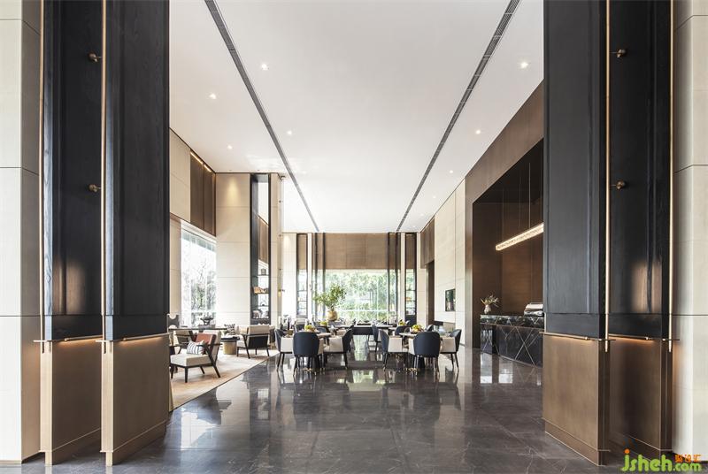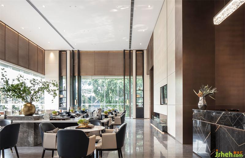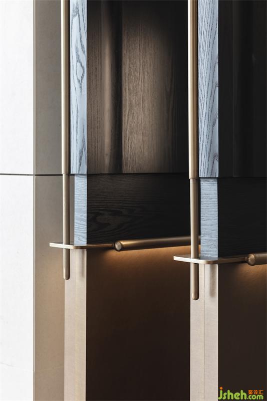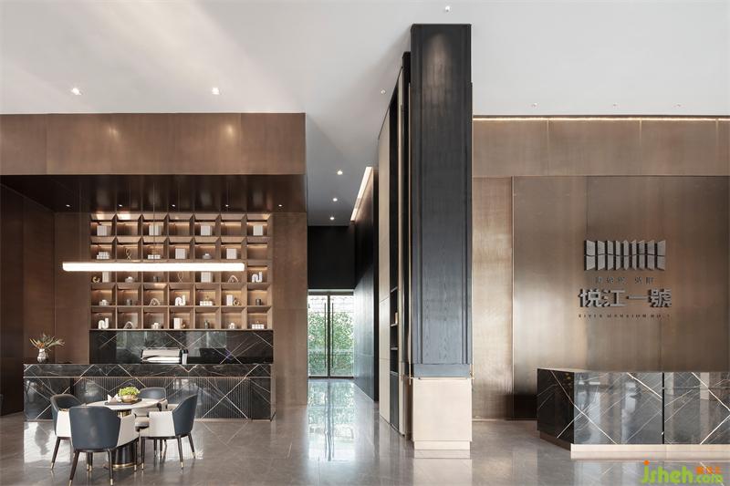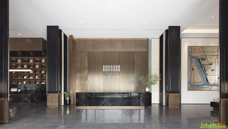 考慮到項目本身的城市以及時代特色,延續(xù)建筑簡練明快的硬性構(gòu)成,運用天然石材、不銹鋼、木飾面、沖孔板等現(xiàn)代而不失厚重的材質(zhì),打造兼具時尚感、力量感的硬朗設(shè)計主體,加入古銅金屬元素作為材質(zhì)的文化植入,并將項目江水悅居寓意的logo圖形在空間中隱序延展,整體營造出一個擁有文化傳承而不失時尚、尊貴的現(xiàn)代都市主體空間。