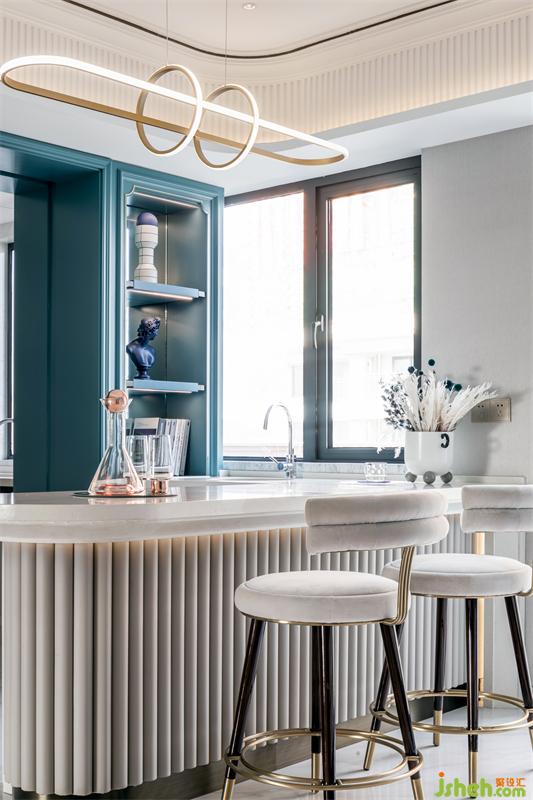 吧臺(tái)的設(shè)計(jì),增加了廚房與餐廳、玄關(guān)的互動(dòng)性,設(shè)計(jì)師使空間最大化利用,讓空間層次清晰分明。