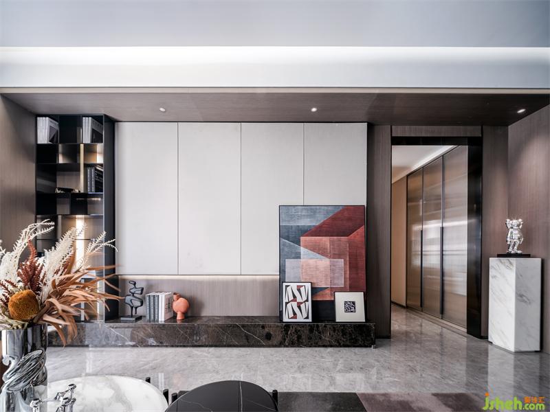 在設定中,男主人是某企業(yè)高管,女主人是雜志編輯,藝術是居者在空間中呼吸、生活、沉浸與作畫的基底。因此,朗昇設計以簡約的筆法、個性化的語素,為這個面積107㎡的居所描繪了有著濃郁藝術氣息的生活圖景。