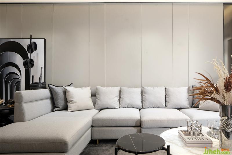 客廳空間輪廓線條以簡潔的直線變化為主,簡練而不失精致。沙發(fā)后的裝飾畫,桌上綻放的干花,增添了空間的觀賞性。
