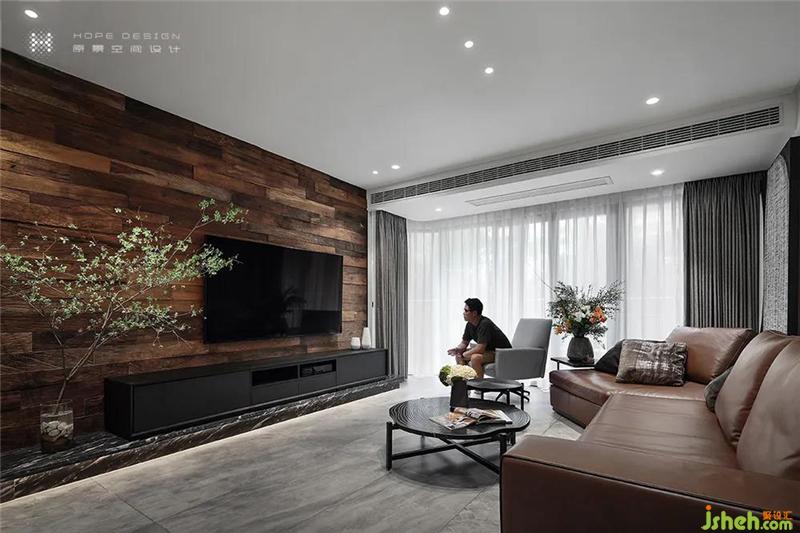 看慣了鋼筋水泥,向往更多的是自然叢林。原木柚木皮做成的電視背景,細看有些許沙孔粗糙感,與同色系真皮沙發(fā)相輔相成,藝術(shù)與質(zhì)感碰撞出別樣韻味。