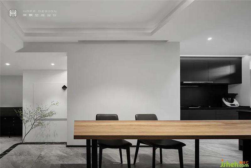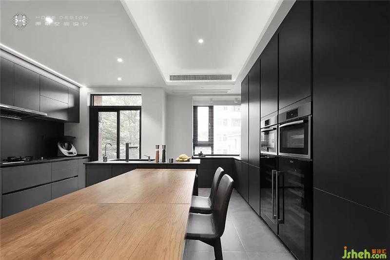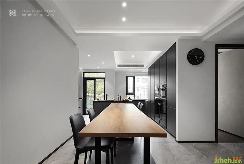 設(shè)計師結(jié)合業(yè)主需求,將廚房旁邊原有的房間和廚房打開,與餐廳空間合為一體。島臺與餐桌連接,創(chuàng)造更多互動空間,三五親朋聚會,悠閑自在,不在話下。深色柜體與木色臺面讓空間延伸,層次豐富,更具穿透力。