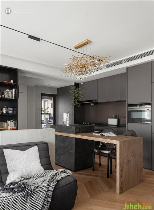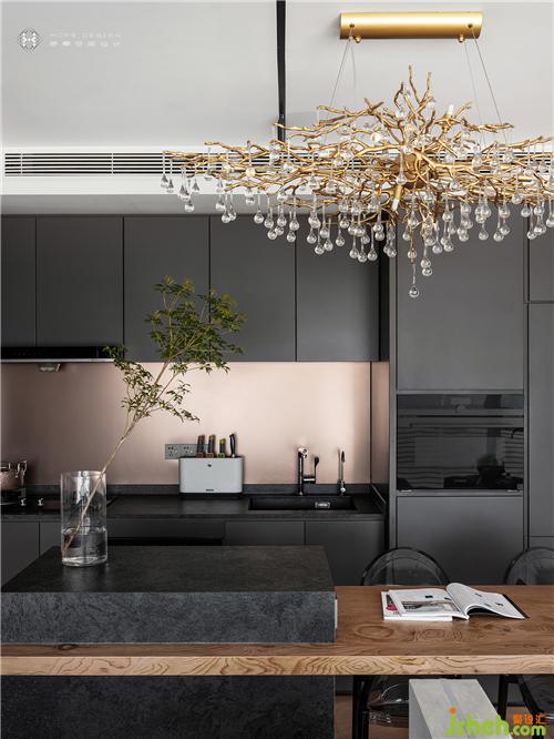 光滑烤漆櫥柜,大氣而不失格調(diào)。定制巖板石中島極好的視覺(jué)延展性,把餐廚整合在一起,創(chuàng)造溫馨溝通區(qū)域,而和餐桌連合產(chǎn)生的高低差,舒適又隨性。再將樹(shù)枝水晶吊燈作為點(diǎn)綴,讓自然元素給予廚房樸實(shí)質(zhì)感。