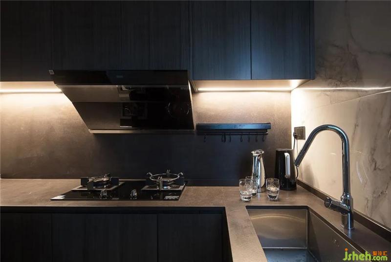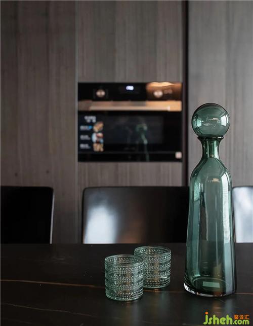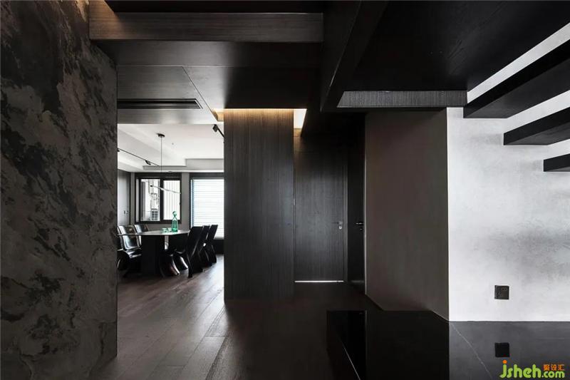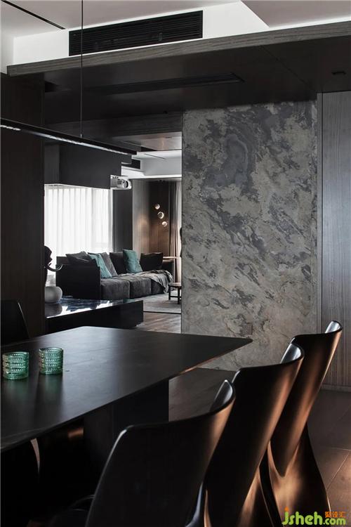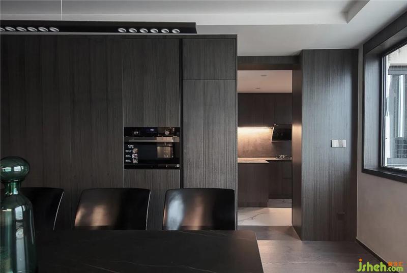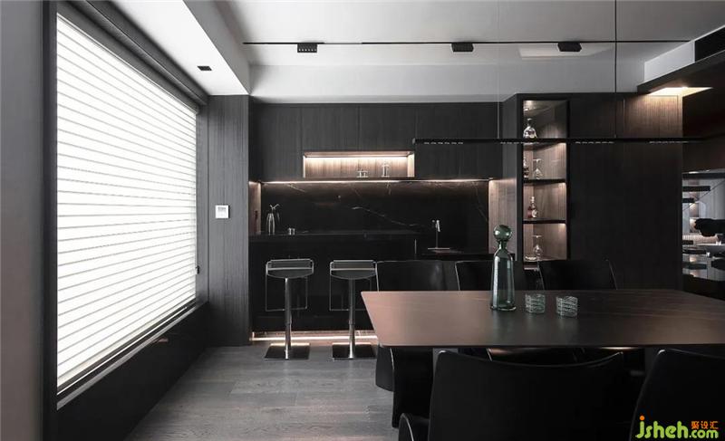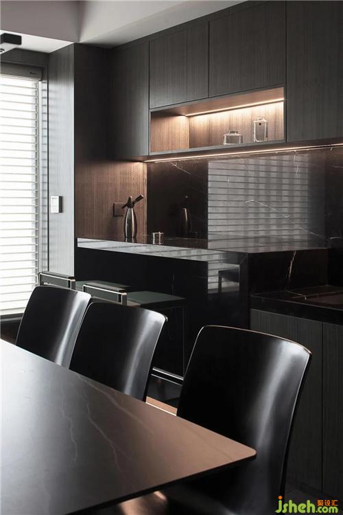 進門處的餐廳空間還是非常寬裕的,整體灰黑色調(diào),采用了局部采光,空間層次豐富。黑色大理石打造的吧臺和木飾面,木與石碰撞極具質(zhì)感,盡顯都市極簡時尚。