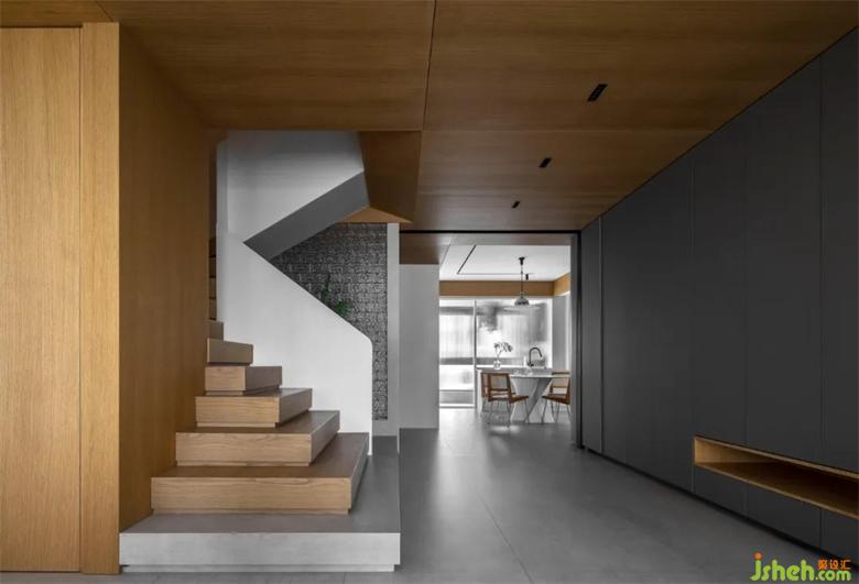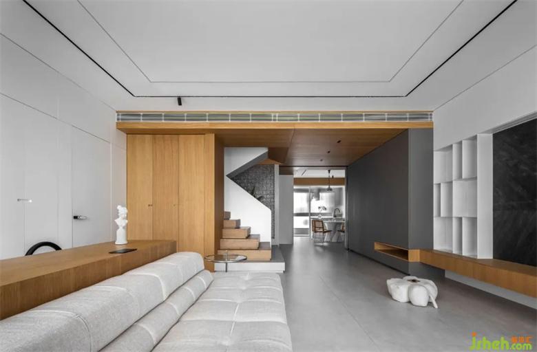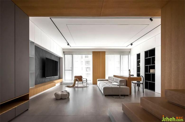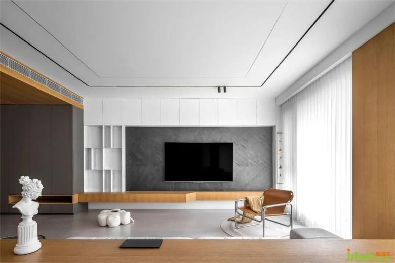 整個(gè)客廳空間采用了無主燈設(shè)計(jì),兩條貫穿客餐廳裝修設(shè)計(jì)的軌道燈就是主要的照明方式??蛷d處輔以筒燈點(diǎn)綴,增加局部區(qū)域的照明度。吧臺的設(shè)置,在空裝修設(shè)計(jì)間兼具多種功能。客廳兩側(cè)的隱形壁櫥設(shè)計(jì),也使得儲存功能大大增加,在兼具美觀的同時(shí)包容生活的雜糅。