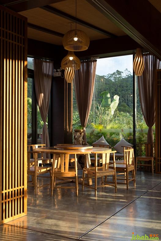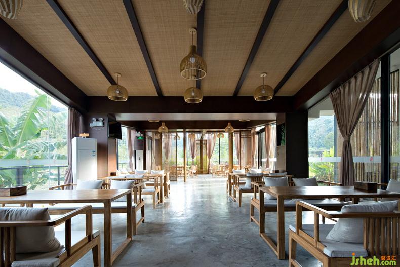 為了讓人更多的接觸自然,大量的竹、木、石是這里的主題,從大堂、餐廳、茶室到客房統(tǒng)一的風(fēng)格讓人時(shí)刻感受到鄉(xiāng)間的寧?kù)o。初入大堂,映入眼中的是一顆裝置藝術(shù)的樹(shù),樹(shù)葉由投影投射出來(lái),演繹四季的變化。天花的草編吊頂,與竹木風(fēng)格相適應(yīng)的同時(shí)也起到陰涼降溫的作用。古樸的茶室與整片荷塘僅有一面玻璃之隔,通透的落地窗讓人一眼望遍窗外的風(fēng)景,坐下來(lái)品一杯茶,溫一壺酒,賞一池蓮。餐廳古典造型的竹編燈飾、茶幾,竹柵欄與鏤空的磚石作為屏風(fēng)阻斷??头渴褂迷炯揖?,軟裝按中國(guó)節(jié)氣搭配色彩,讓人時(shí)刻擁有愉悅的心情。從草席吊頂、實(shí)木桌椅,到竹編茶幾、竹柵欄,隨時(shí)隨地都保持與自然的連接,無(wú)一不讓人感覺(jué)到溫暖安心。