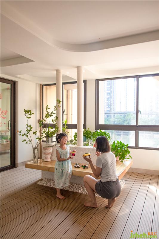 能在霓虹之間穿梭流淌,也能在小院里看綠植尺寸生長觀察四季變換,感受生機盎然。一方花園鏈接著兩個小主人與大自然的親密關(guān)系 溫潤質(zhì)樸的塑木地板與地磚區(qū)別開來圈出一塊,可以隨意落腳的自然樂園肌膚所及,也變得友好親密。