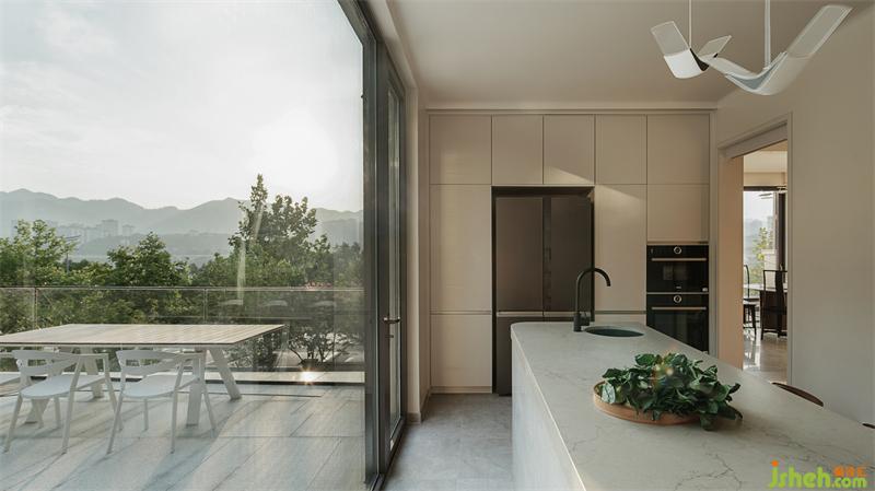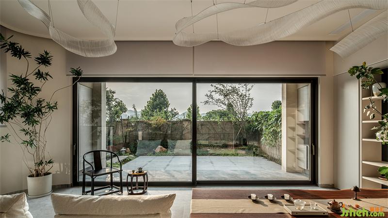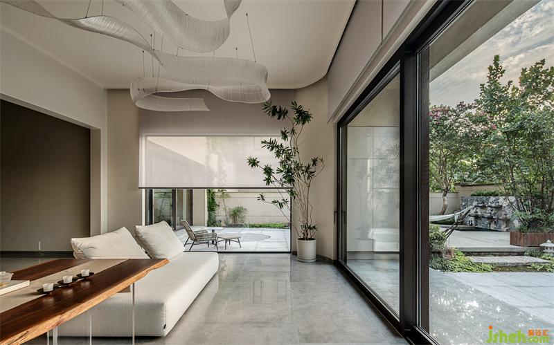 茶室的一抹飄帶懸掛空中,搭配沙發(fā)圓椅,營(yíng)造出柔和、流動(dòng)之感,與大尺度的門(mén)窗,高達(dá)四米的空間高度帶來(lái)的力量感形成鮮明對(duì)比。原來(lái)正如寓言里的北風(fēng)與太陽(yáng),溫柔才是愛(ài)中不可戰(zhàn)勝的力量。