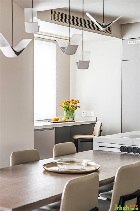 餐廳與客廳中間設置了隔斷,質(zhì)感十足的長虹玻璃既可以起到半遮擋的作用,私宅設計也能夠保持空間的通透性。綠色的植物點綴了室內(nèi),讓家中充滿生機和自然靈韻。