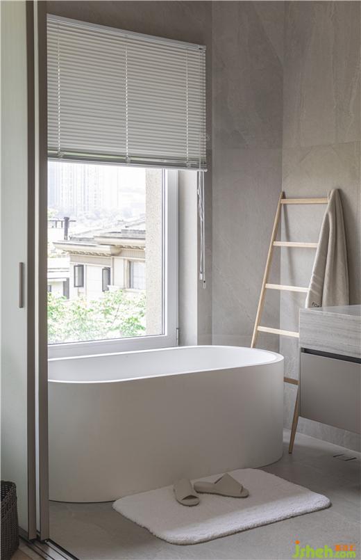 衛(wèi)生間冷灰瓷磚、大理石臺(tái)盆、柔軟地毯,