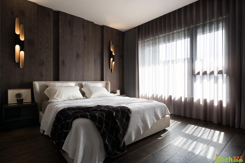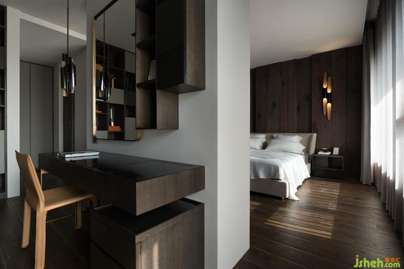 主臥室善用床尾視聽牆當分區(qū)介質,增設專屬更衣間機能,視聽牆正面採皮革軟繃,縱向的分割線條,恰與床頭牆面立體堆疊的木質板塊相呼應。