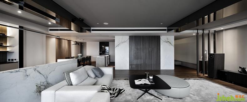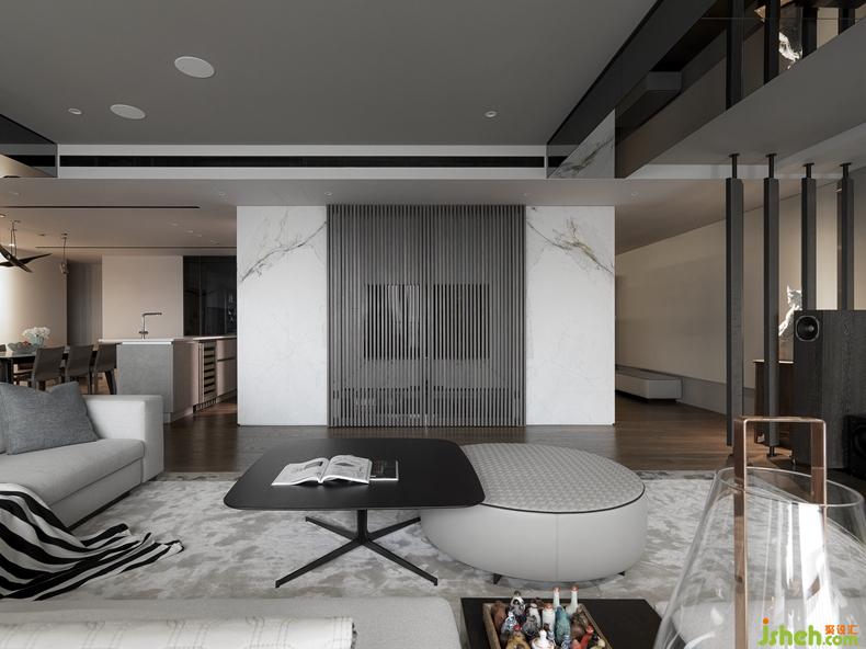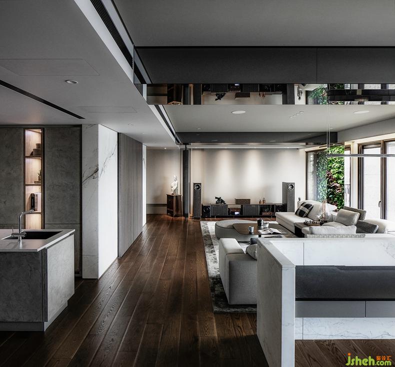 A large gray surface is used throughout the common area. With the playful use of blocks, a three-dimensional continuous image is produced, which gives the common area a sense of flow. The use of modern Italian furniture in low saturation colors gives the impression of more space. These various features present an effortless design for the occupants. The main wall in the living room, the back end of the reading area, and the display wall at the end of the diningroomform the core of the entertaining area. Apart from making good use of non-invasive materials such as wood and stone to achieve the back-to-basics visual effect, a variety of cutting edge modern technologies have also been applied to allow the occupants to enjoy the high-quality details.