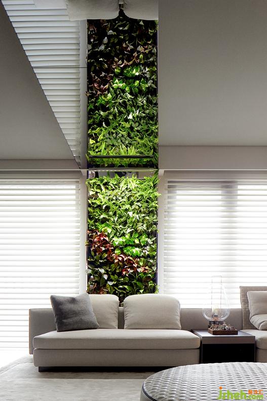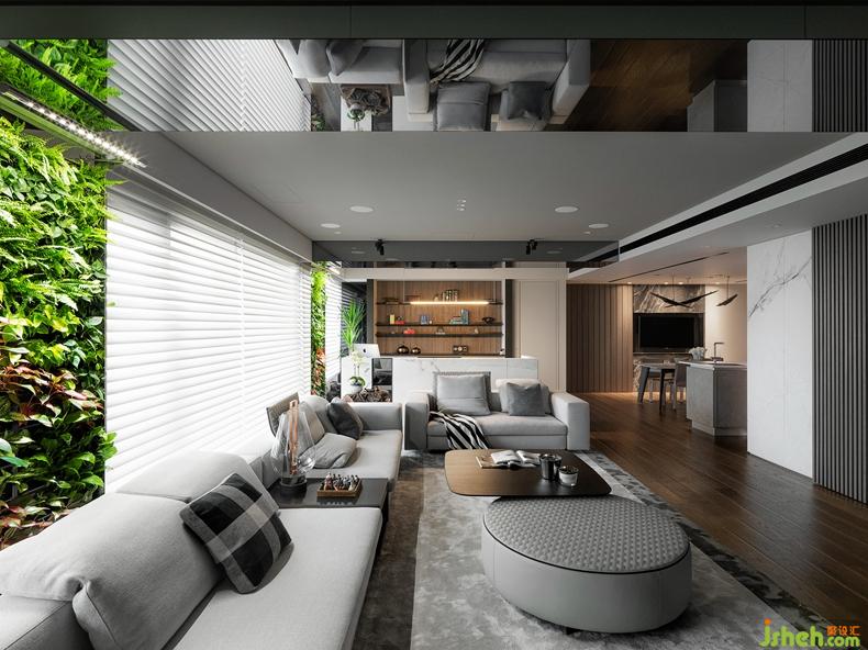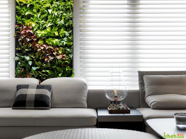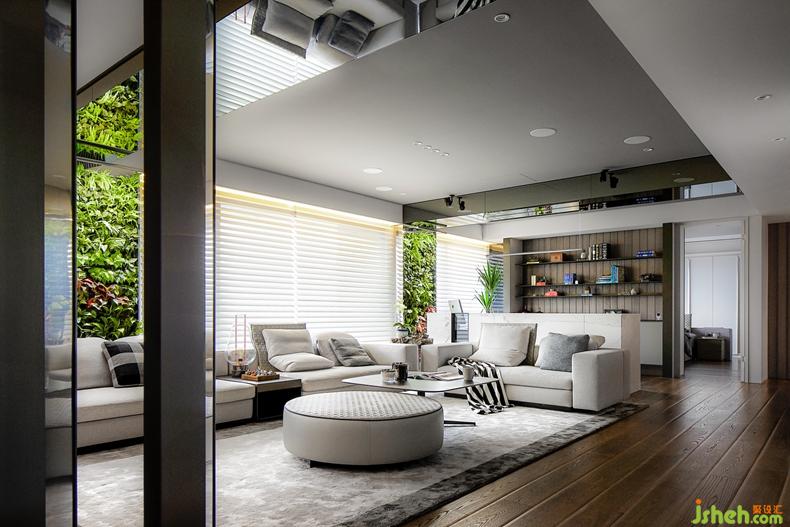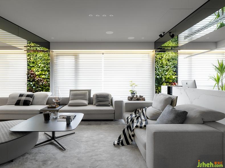 首先在客廳窗與窗間的結(jié)構(gòu)柱位置,大膽導(dǎo)入室內(nèi)植生墻設(shè)計,結(jié)合專利的滴灌系統(tǒng)與照明,帶動居宅內(nèi)全時段進(jìn)行的活氧光合作用,而在兩列縱向的植生墻上方天頂,依等寬設(shè)置兩座為橫樑的水平向鏡盒,借鏡面倒影創(chuàng)造全視角的室內(nèi)花園意象,目光所至,一天的疲勞跟著煙消云散。