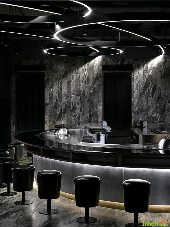 Layered lighting emphasizes the play between brightness and darkness, as it highlights and facilitates the interaction between the movements of the chef and comfort of the diners. Curved lights overhead brighten the cooking area whilst leaving the dining area pleasantly illuminated.