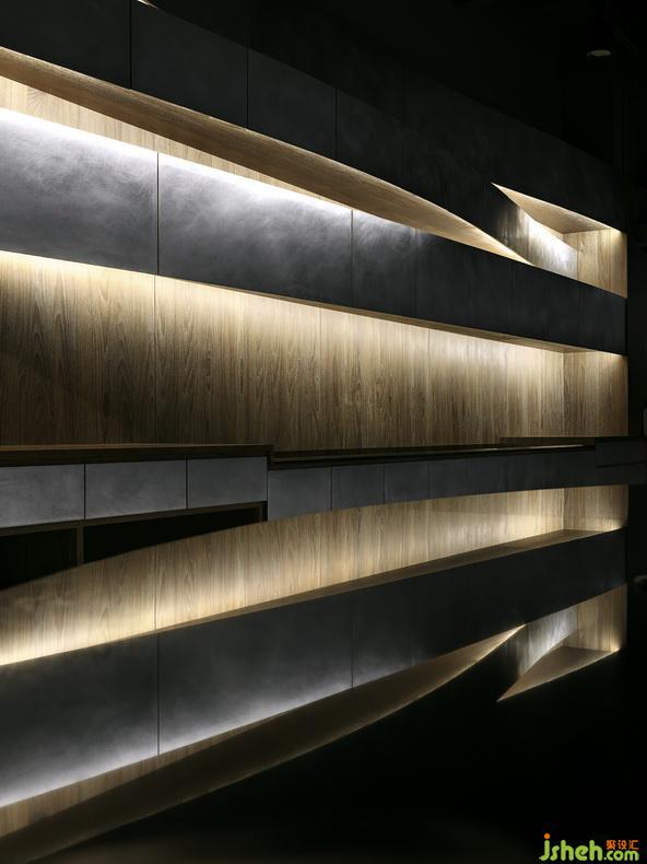 3. 背景墻面以溫潤木質(zhì)襯底,橫向波段線性柜體使用金屬包覆,與背襯光源共同演繹層次律動的空間意象。