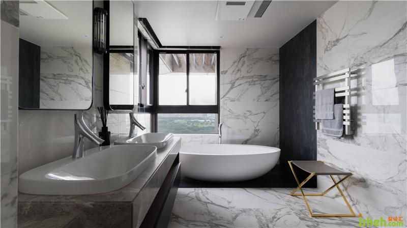 在玄關(guān)、中島廚房與客廳之間,除了靈活運用差異地材鋪設(shè)、天地壁的黑白色相對比、訂制家具燈藝擺設(shè)等手法,象征性劃分場域?qū)傩酝?,于細?jié)處的經(jīng)營尤其深刻,像是蜿蜒騰飛于玄關(guān)至中島上方的大型金屬流體燈藝,設(shè)計者取屋主事業(yè)有成、衣錦還鄉(xiāng)為名,交融魚形線條和水岸波紋無邊無際的優(yōu)美大器,打造公領(lǐng)域動中有靜、靜中有動、獨一無二的主視覺概念,隱含其中的情感因子,也醞釀出空間的無垠詩意。而中島后靠背景墻同樣饒富機趣,老師傅親手施作的潑墨砌花工法,對話兩側(cè)鍍鈦金屬、條紋玻璃立面,不僅富于藝術(shù)性,也平添空間相對柔軟的人文底蘊。