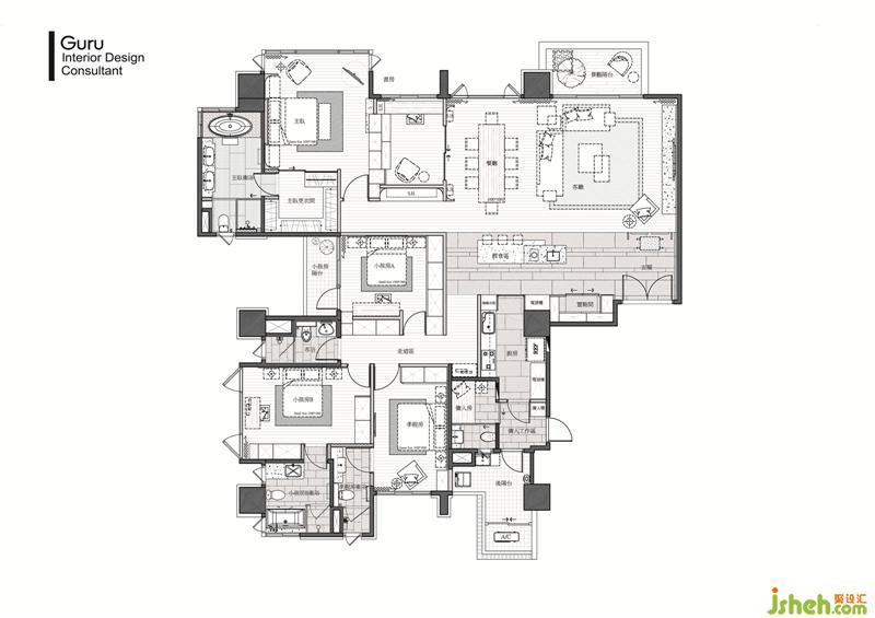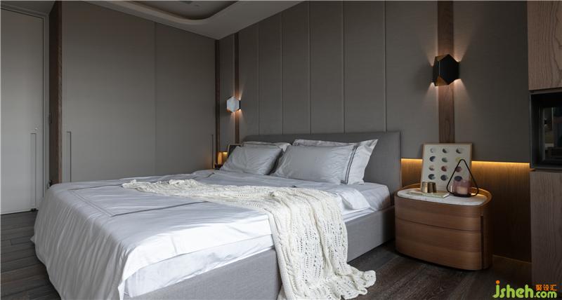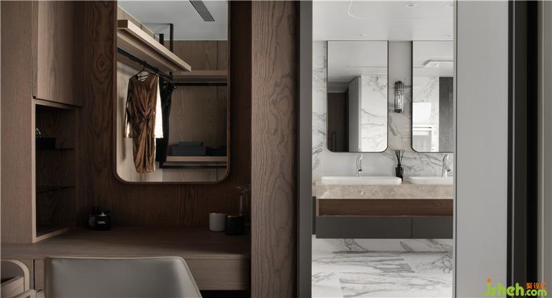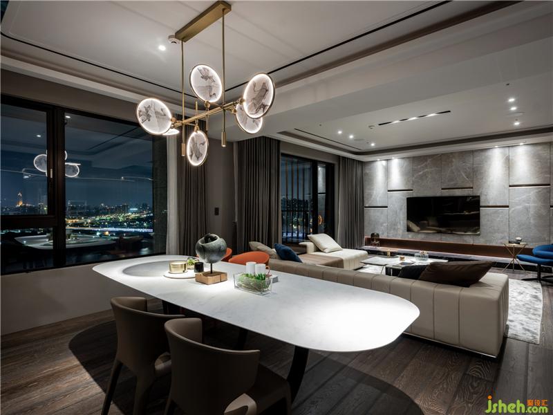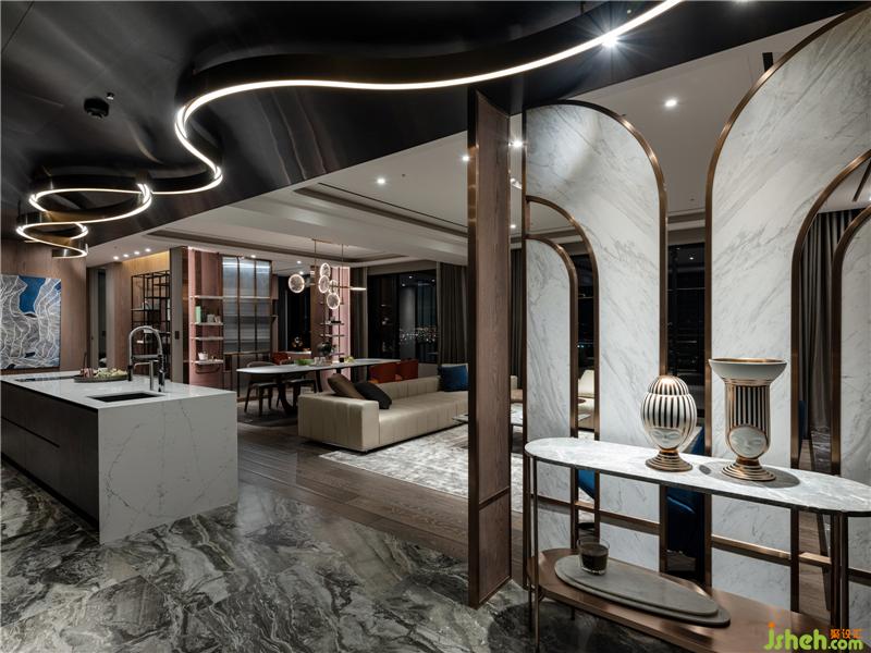 全案游移在俐落現(xiàn)代基底與新東方古典的悠遠之間,首先電視主墻簡斂卻不失活潑律動的線性架構(gòu),交織不同材質(zhì)的錯層堆疊與溫潤,懸垂于餐桌上方的銅金色燈飾,四向開揚的圓形扇片以透光石材制作,激似水墨畫的肌理,流露古詩畫特有的文人浪漫。此外,以屋主英文姓氏發(fā)想的?圓弧角語匯,也成為賞翫全案的關(guān)鍵線索,包括公領(lǐng)域分區(qū)天花板造型,兼顧精致間接照明和隱匿梁下差的積極目的,另外還有懸置于書房入口兩側(cè)的金屬層架、浴室掛鏡、面盆、鑲嵌于天花板的特殊霓虹矽膠軟條燈帶等等,都能深刻體現(xiàn)圓弧語匯所代言的專屬性與尊榮感,而通往私領(lǐng)域的廊道也特地擴張至120cm寬,側(cè)向展示柜強化視覺深邃,幅寬則確保長輩行進間的舒適尺度。裝修公司