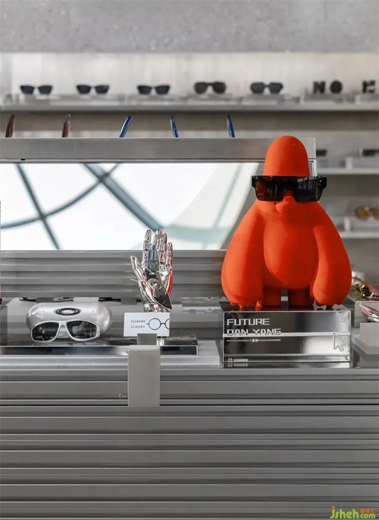 在接待處最先向我們招手的是友愛科技金貓,它是探索未來生活的新形象。裝修設計銀色的服飾,閃爍光芒的紅色眼鏡,充滿了極致的未來科技感。棱鏡質感的服飾和閃耀的視光眼鏡,都象征著科技金貓對未來生活的極致追求。