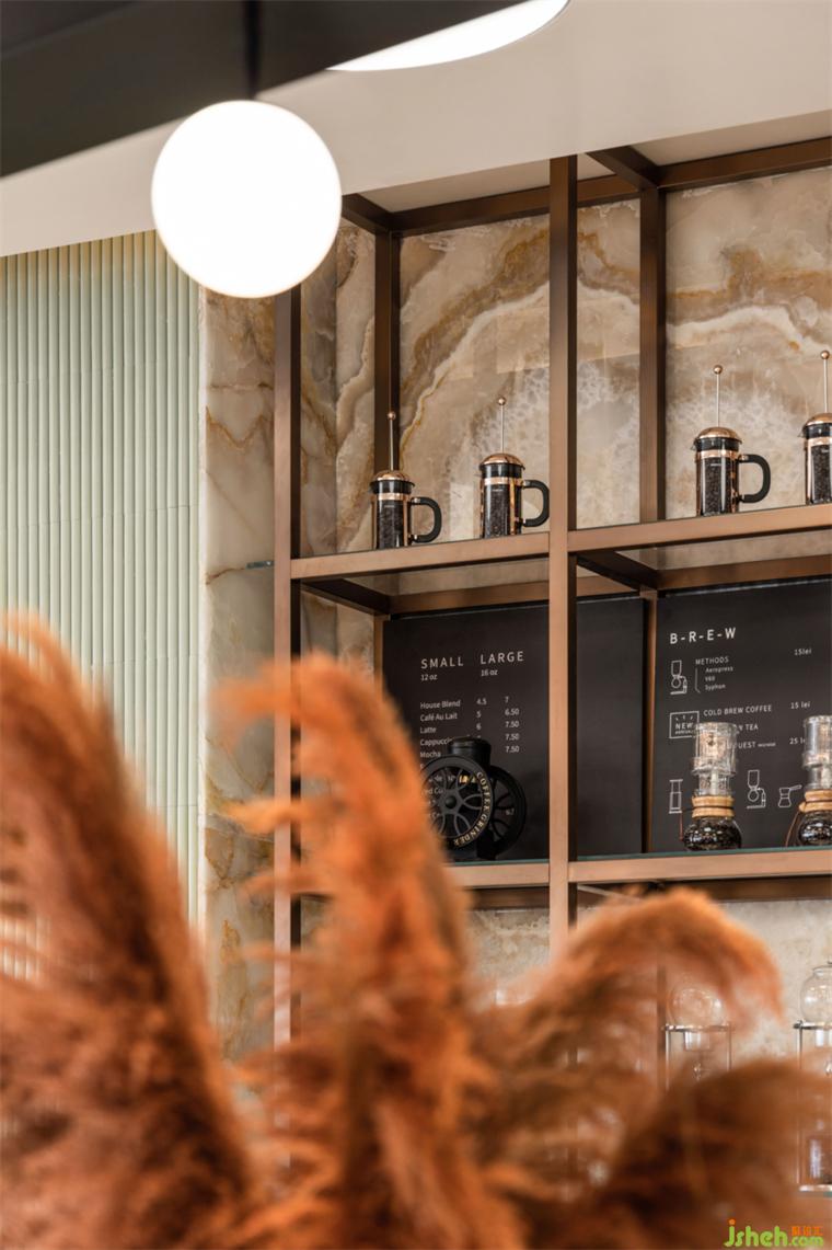 都市生活中的人們對于咖啡的熱愛是真切的,正如咖啡愛好者對于咖啡豆的品種也熟稔于心。售樓處設(shè)計在色彩選用上,綠色和紅色的輕微撞色,但最終在棕色為主色調(diào)的場域中實現(xiàn)了和諧。金屬材質(zhì)的使用,為空間帶來了摩登時尚的氣息。
