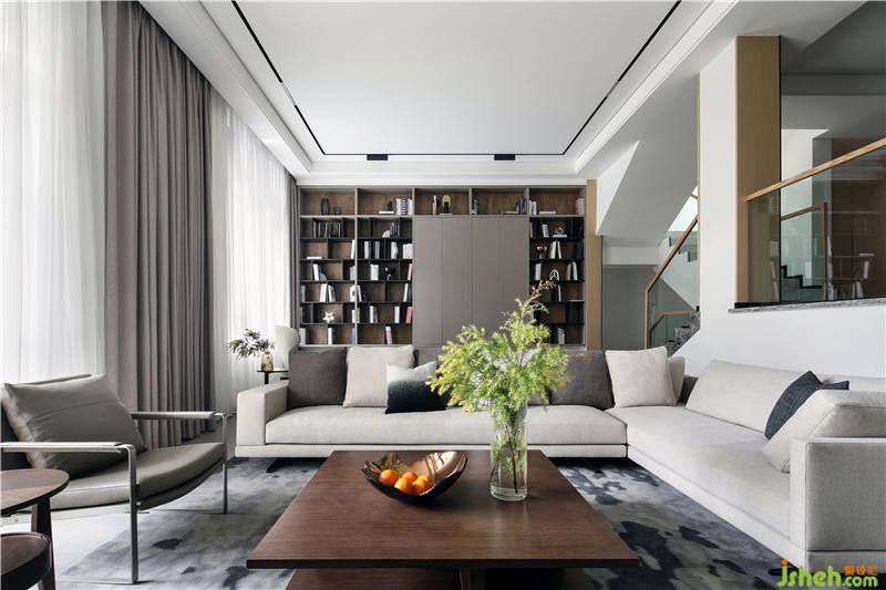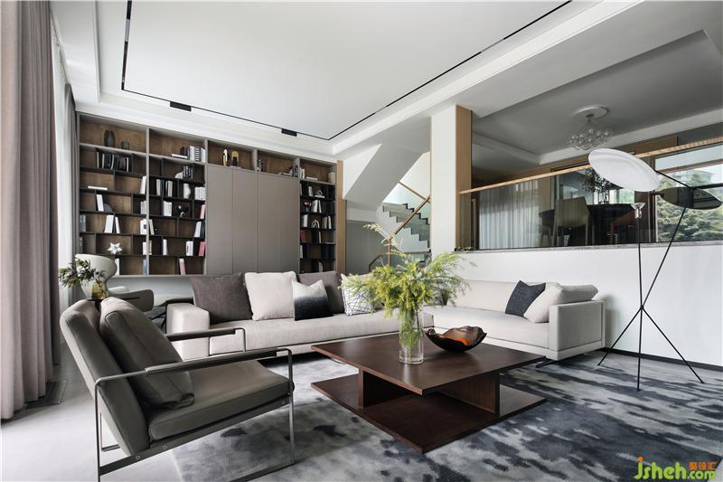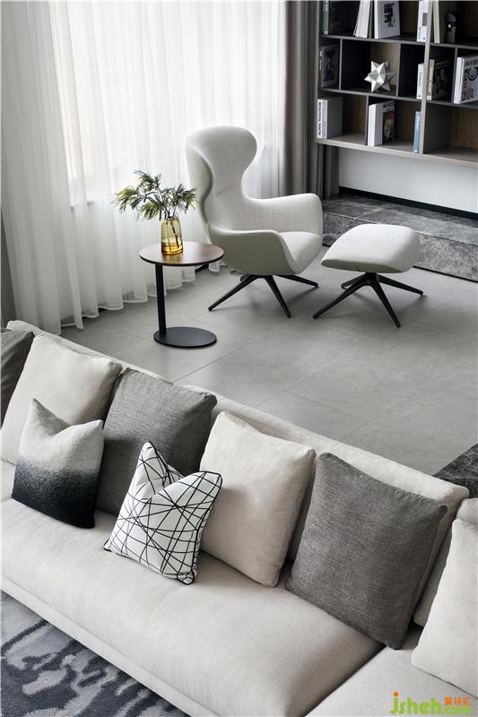 休閑廳為客廳的補充空間,位于樓梯平臺旁,沉穩(wěn)質感的書柜鋪滿整面墻,如源頭活水般浸潤著整個空間,正是“書卷多情似故人,晨昏憂樂每相親”。
