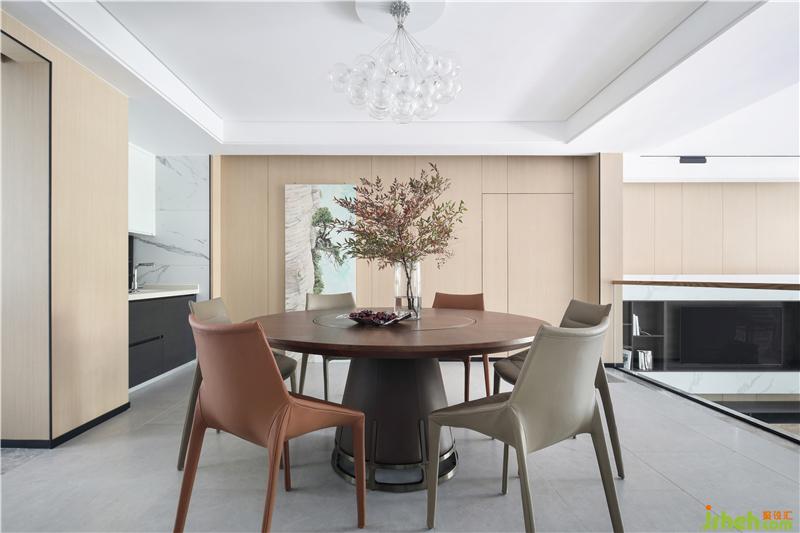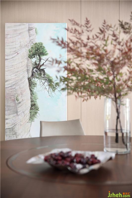 原木材質的家具,油畫中遒勁的峭壁蒼松,餐桌上的疏影橫斜的瓶盞,自然質樸,在濃淡相宜的雅致中,愈增清新與活力。