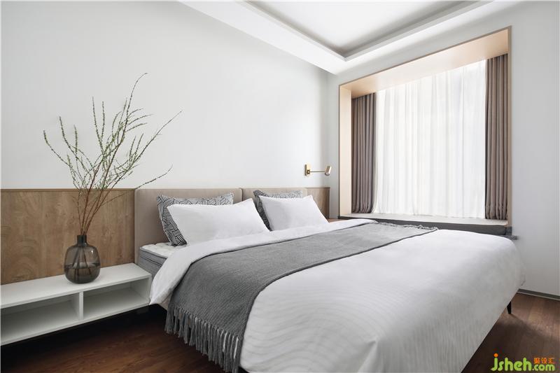 二樓主臥的整面玻璃窗引景入畫,將小區(qū)水景和自家后花園的美景盡收眼底。衣柜做了隱藏處理,讓空間簡凈有序。